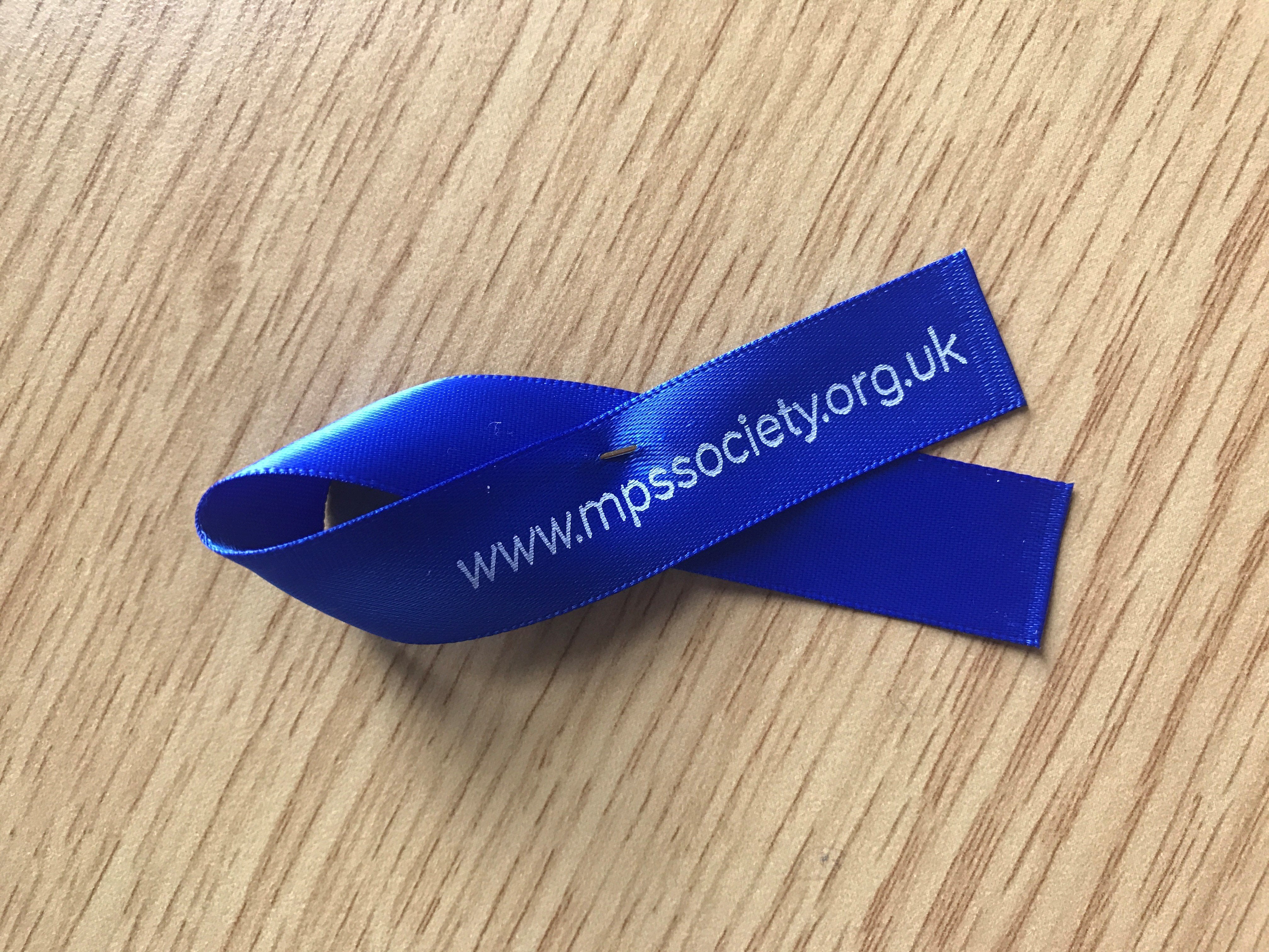 Blue ribbon with the MPS Society website in white with a pin badge at the back to fasten to clothing.